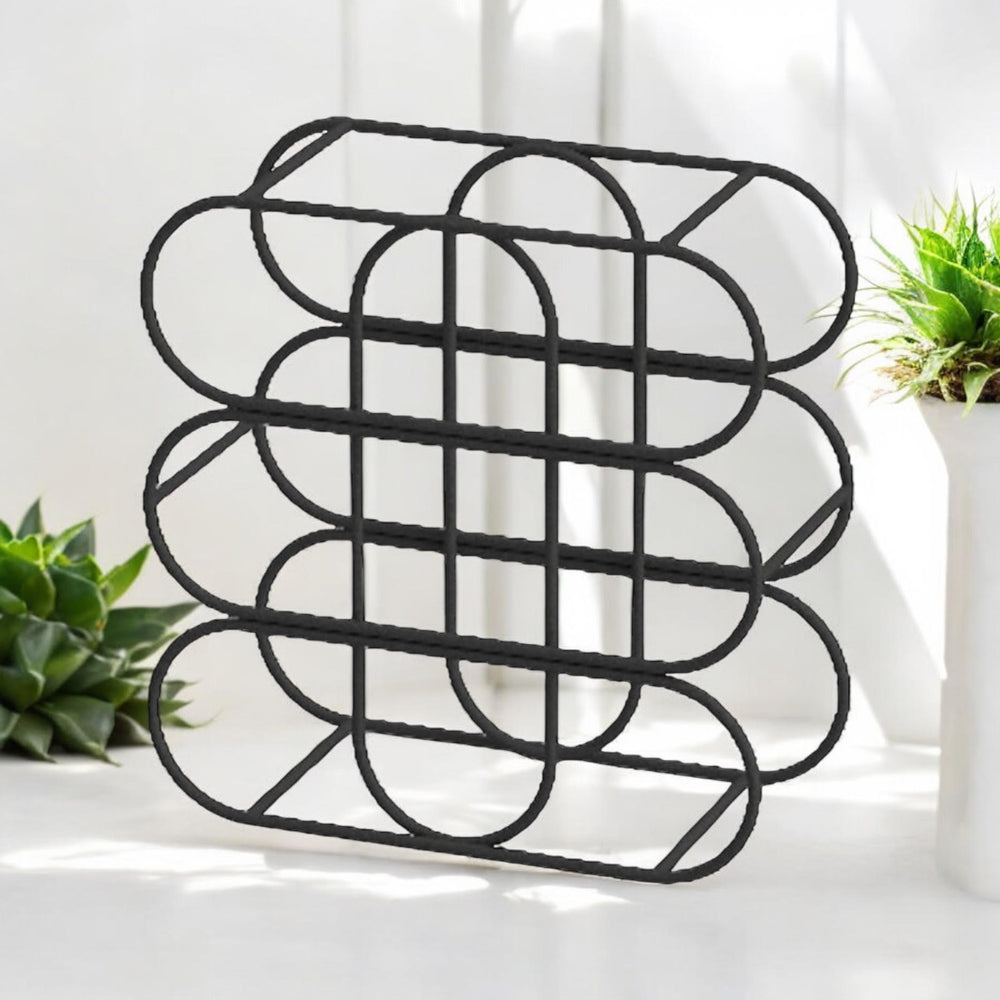 A delightful, hand cast iron effect wine rack with stunning ornate side detail. This heavy and beautifully designed piece will hold 9 full bottles of your favourite tipple and is available in natural cast iron effect