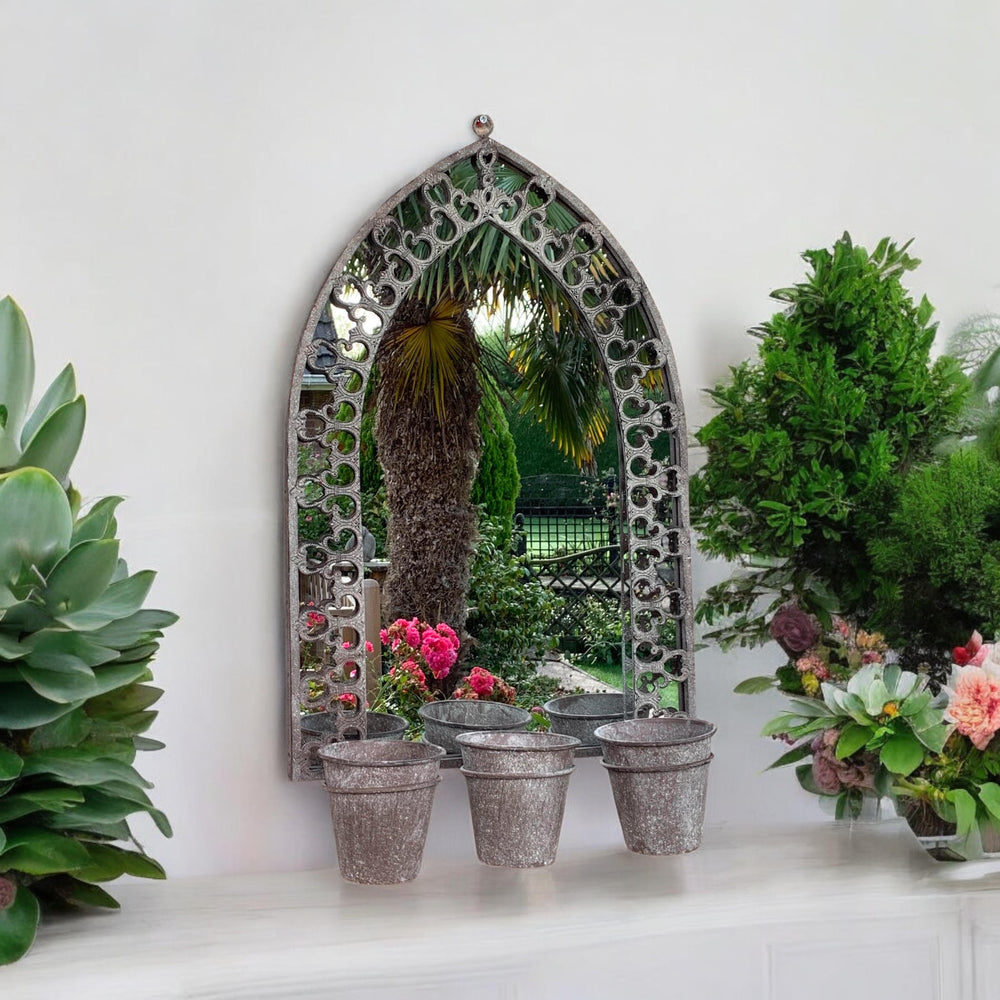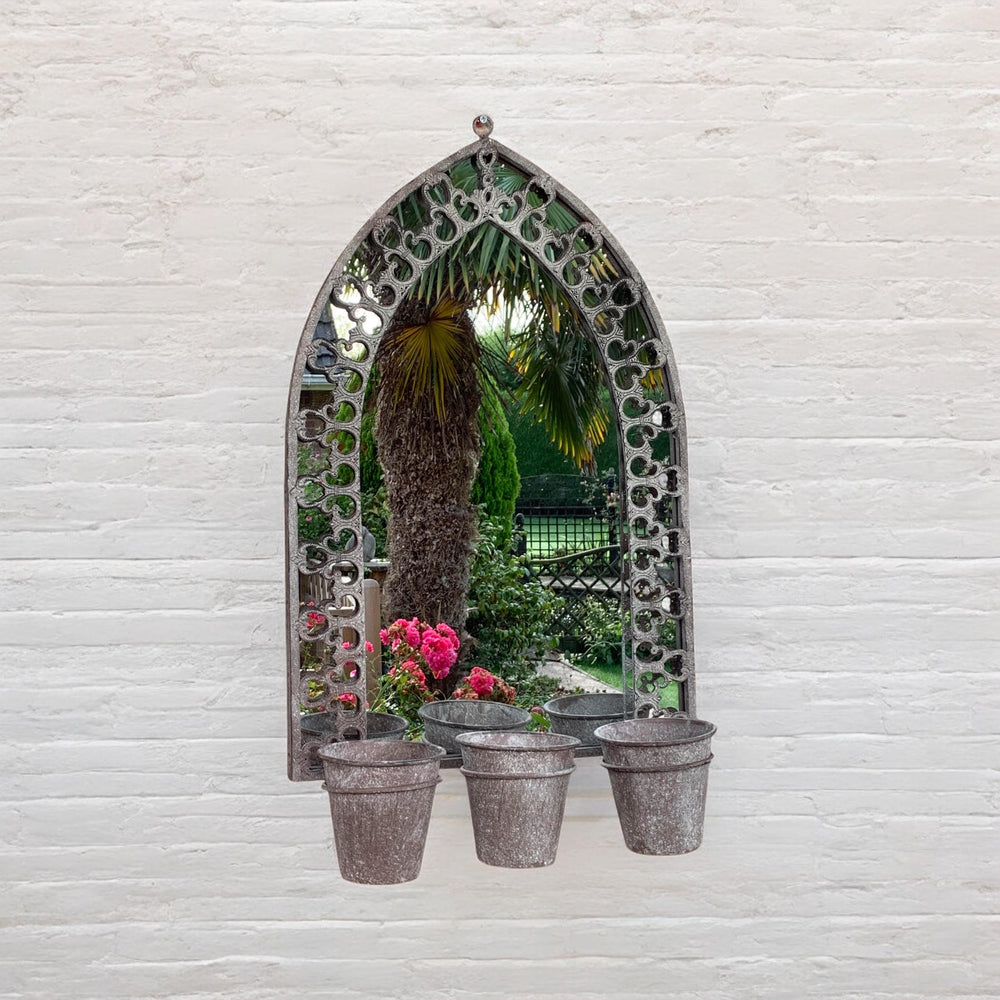 A decorative metal mirror with an antique finish complete with 3 planter holders and pots.