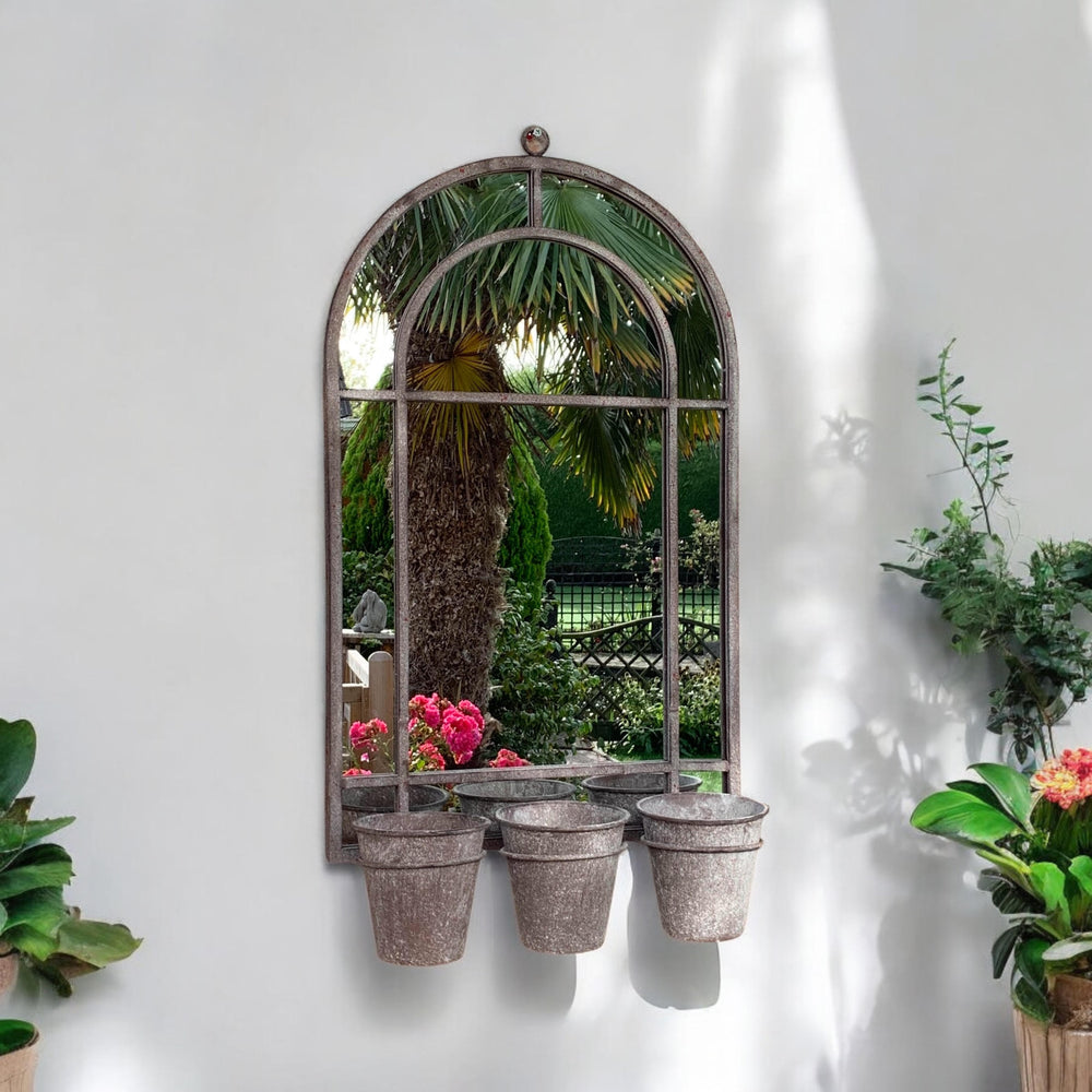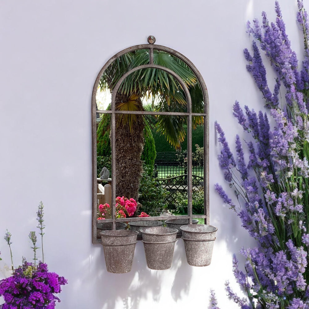 A decorative metal mirror with an antique finish complete with 3 planter holders and pot.